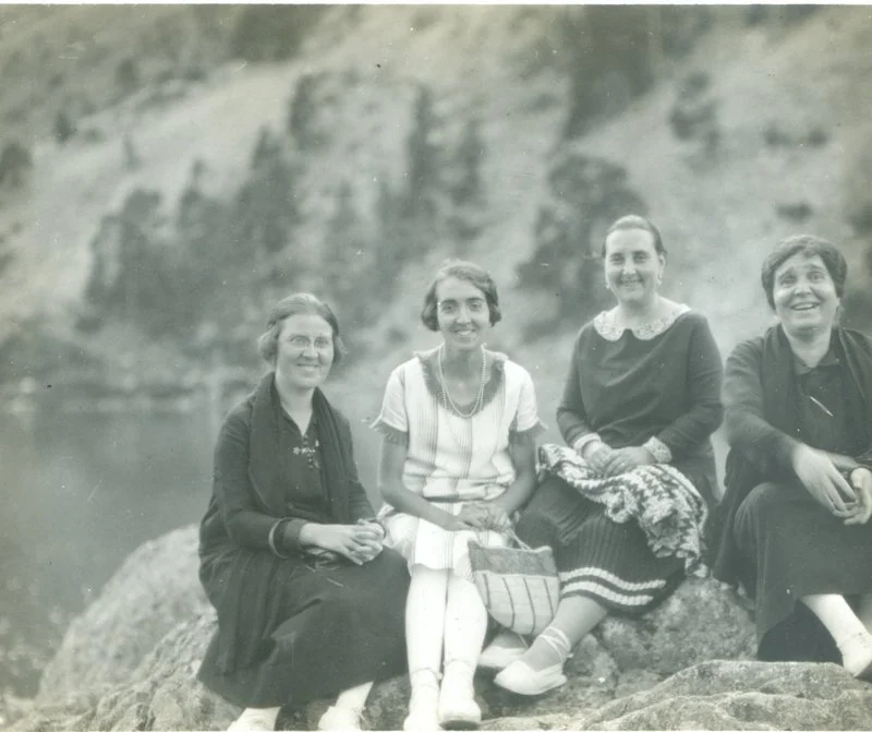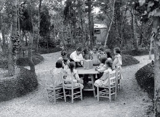 Rosa Sensat amb l’alumnat en una classe a l’aire lliure a l’Escola del Bosc, entre 1920 i 1925.